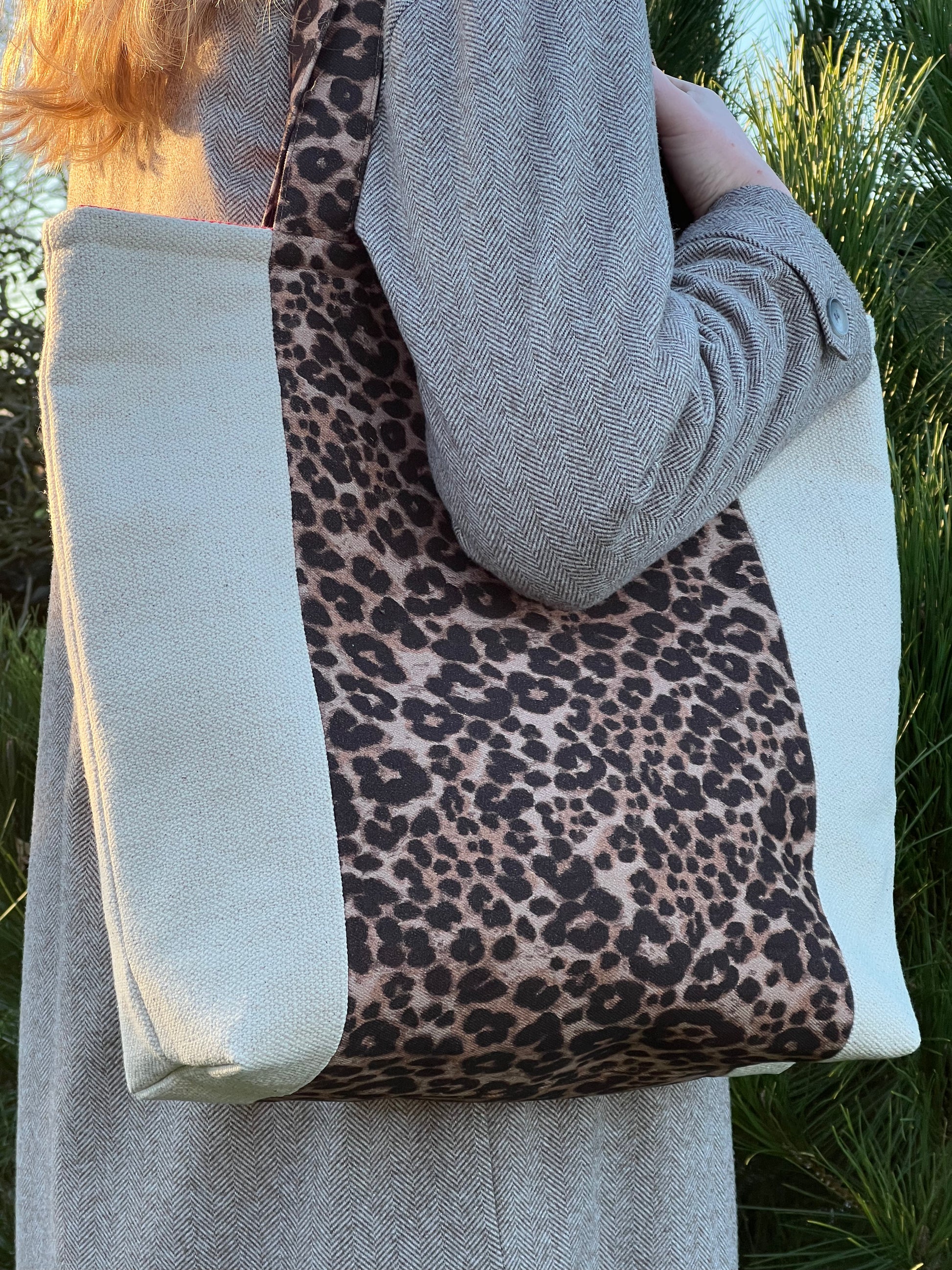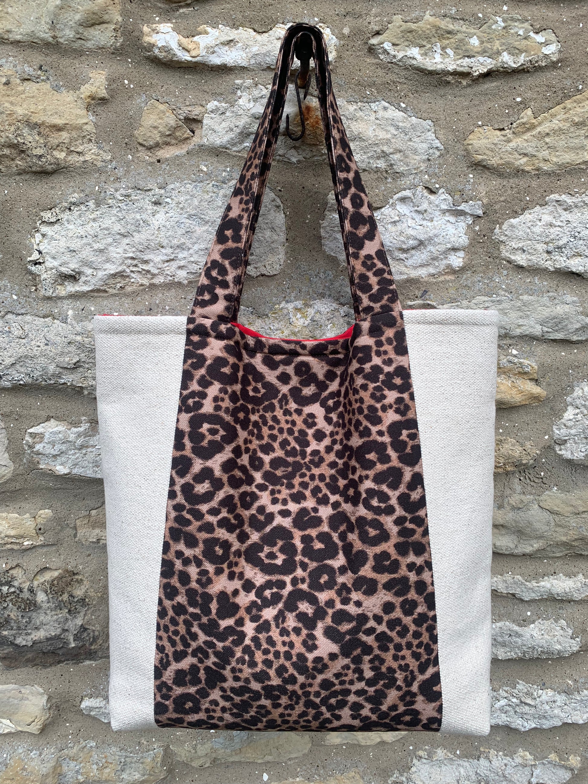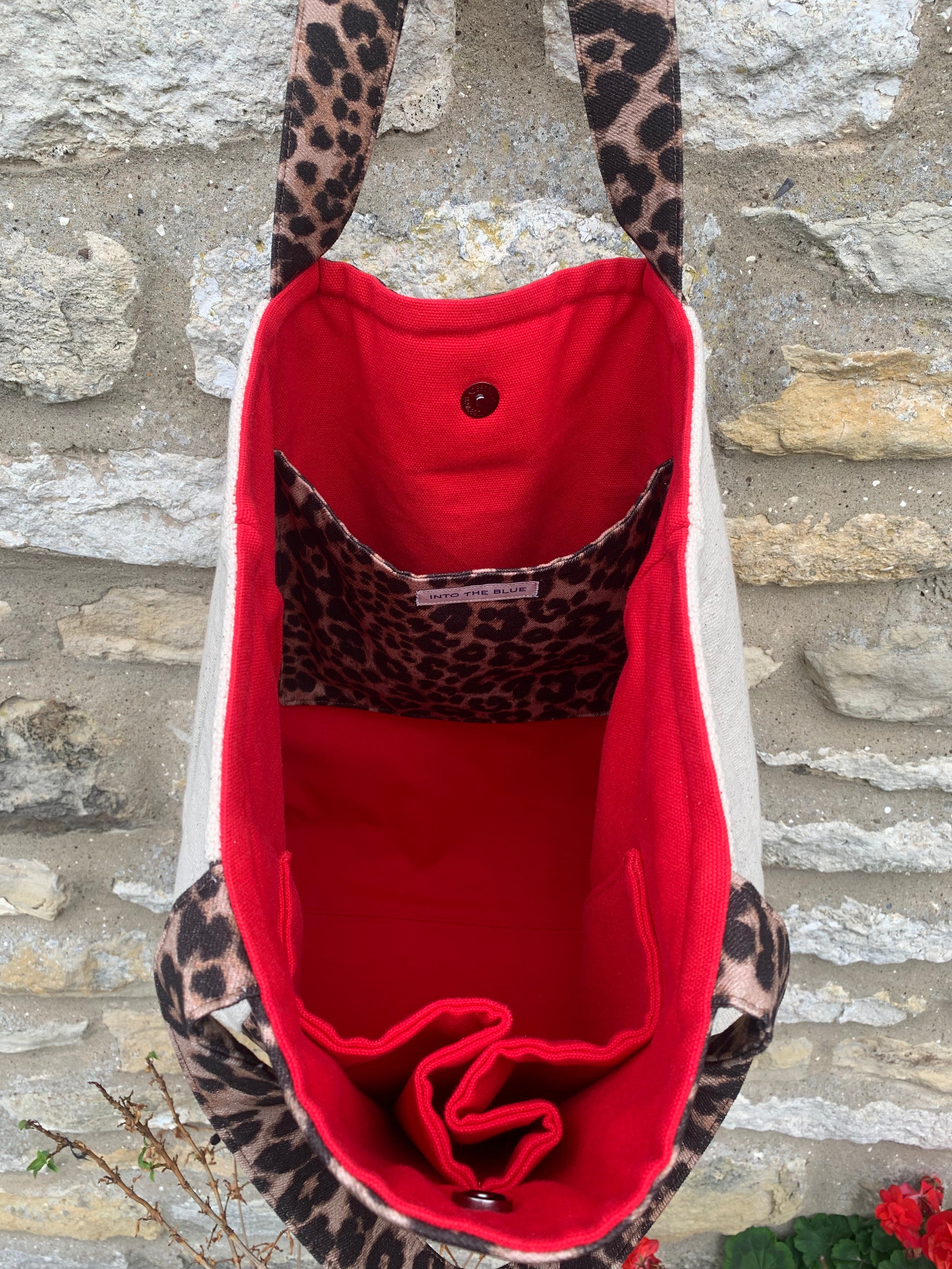 DENIM CHOCOLATE AND BLACK LEOPARD AND STONE BEIGE LINEN LARGE TOTE SHOPPER WITH VIBRANT RED CANVAS LINING, FUN SHOPPING TOTE OR STYLISH WORK BAG, HOLDS LAPTOP
