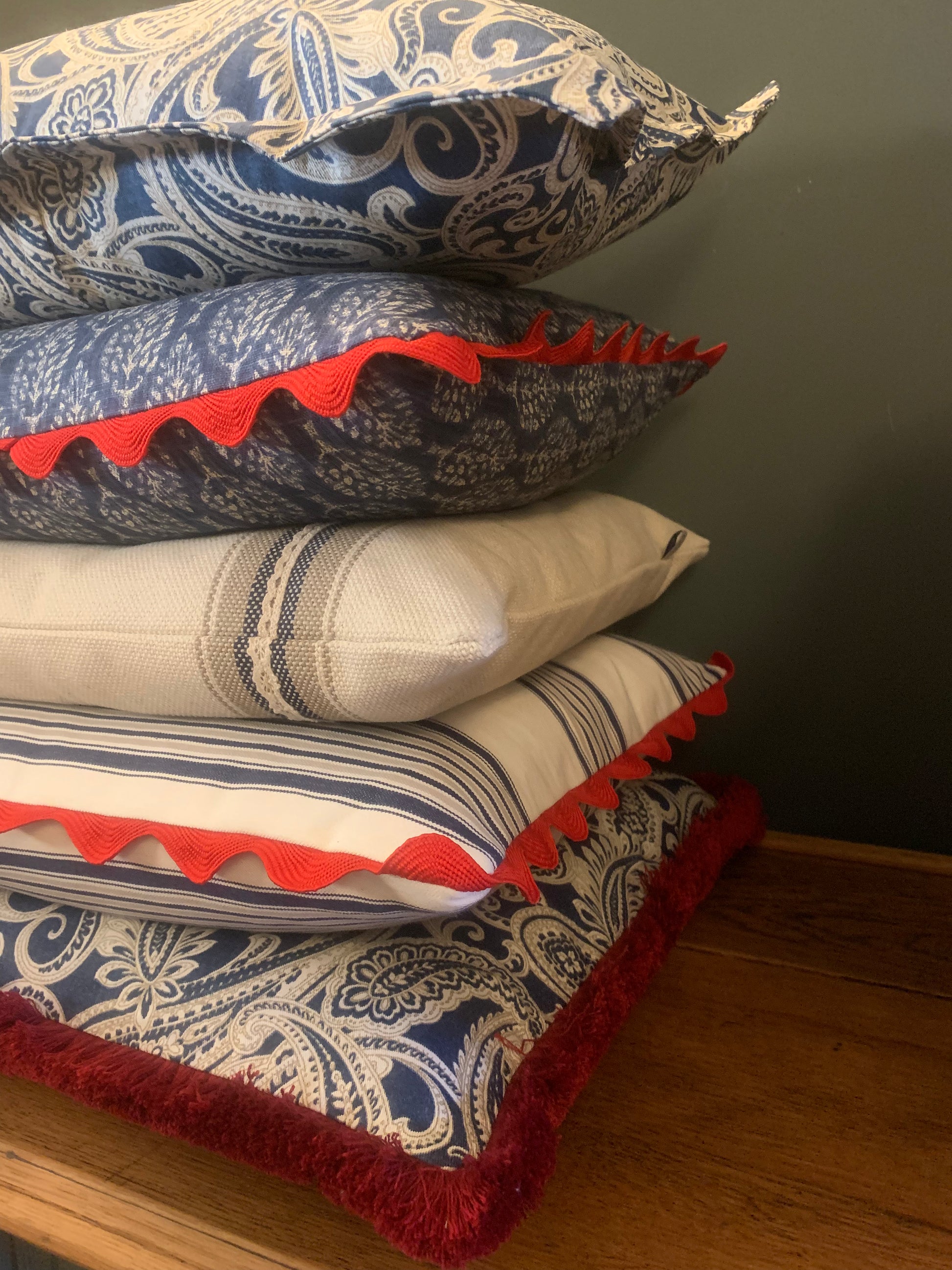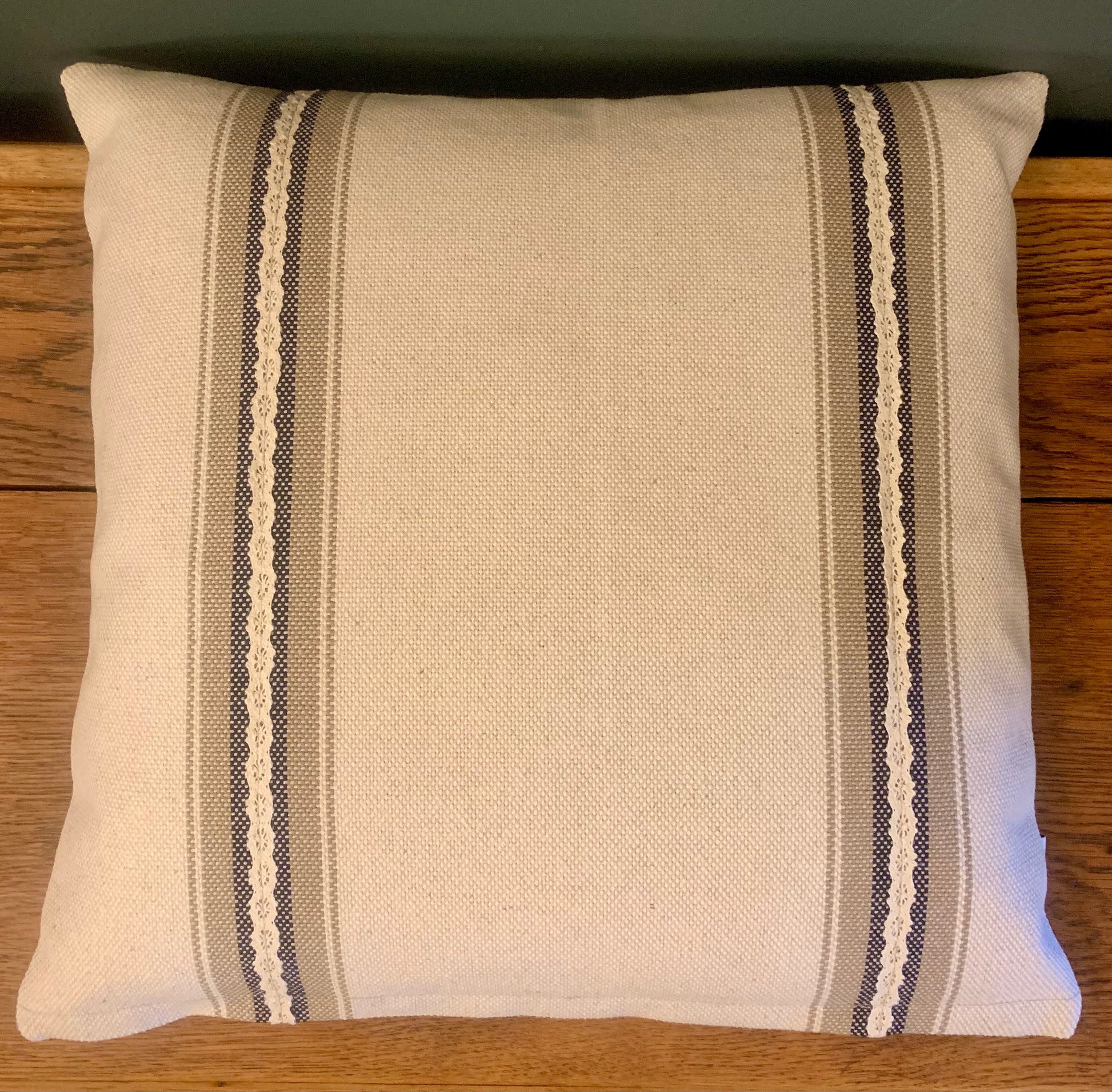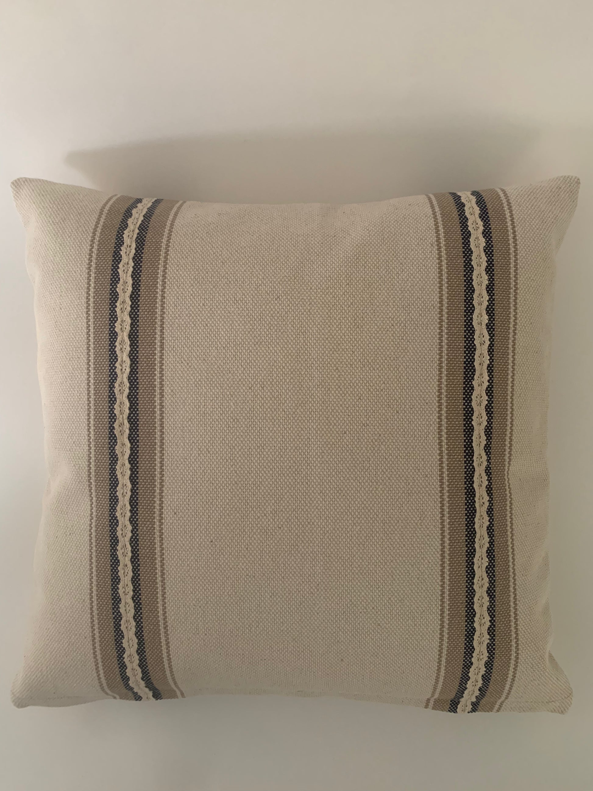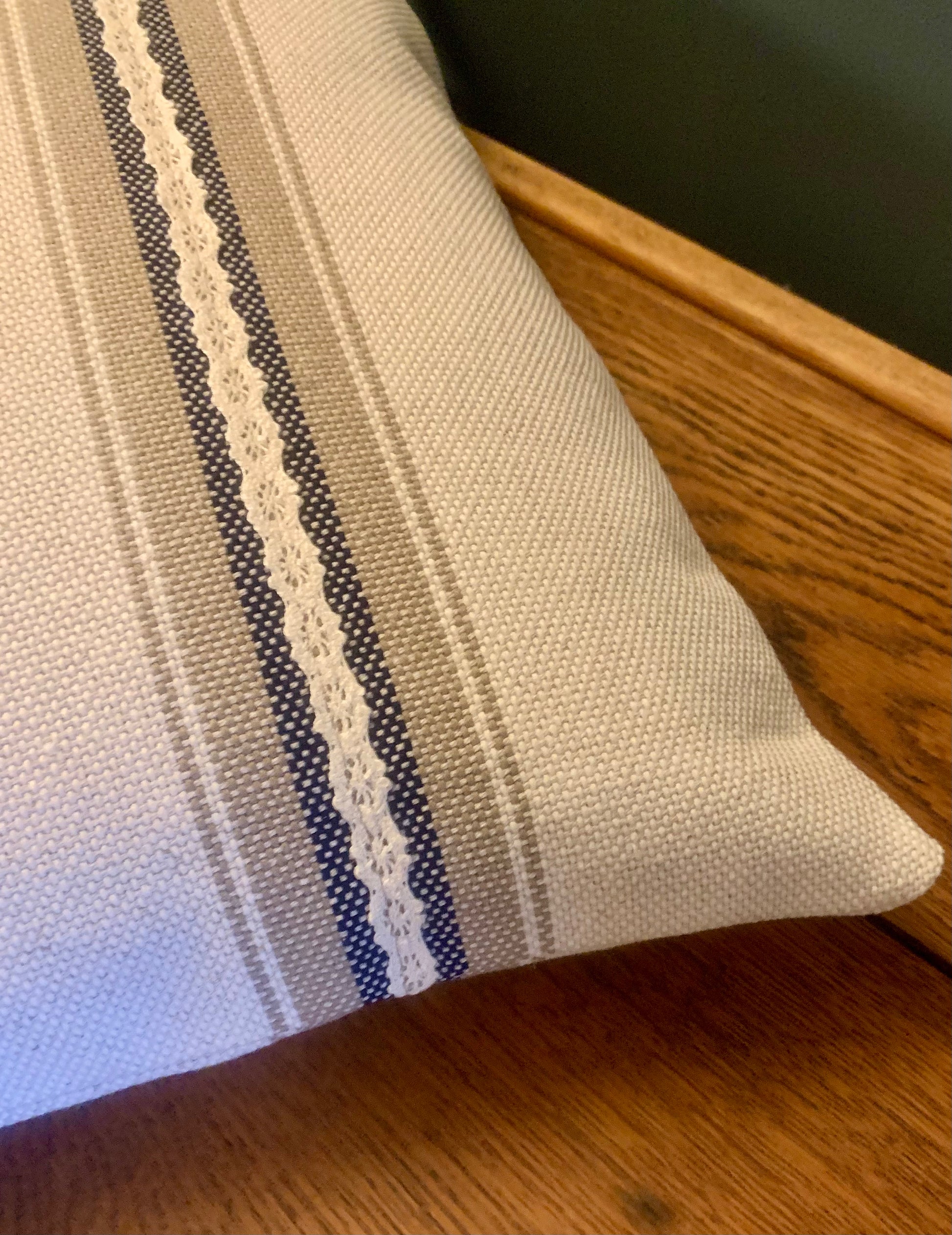 FRENCH INSPIRED STYLE IN LINEN SACKING WITH NAVY AND KHAKI STRIPE, ENHANCED WITH VINTAGE COTTON LACE DETAIL