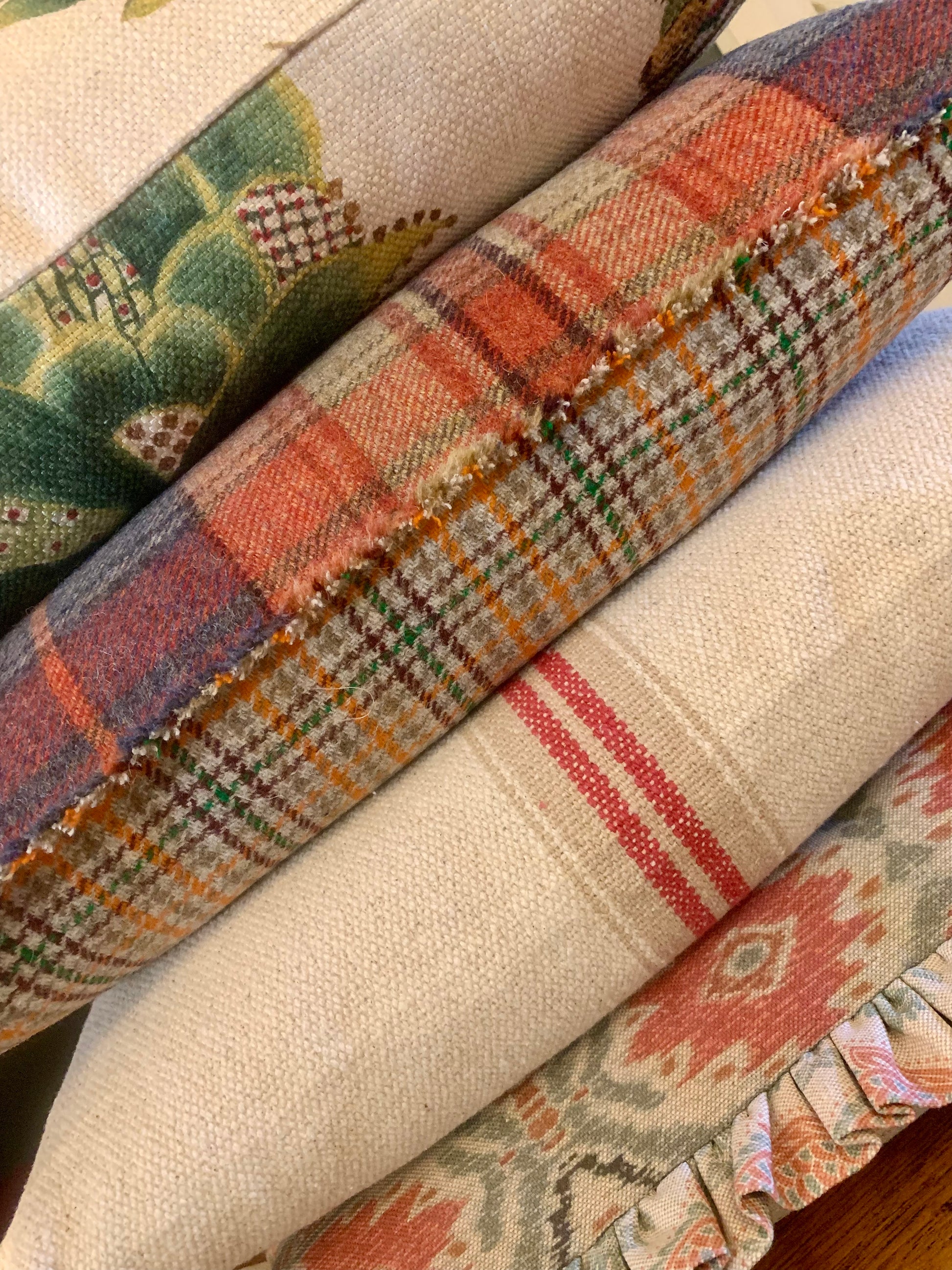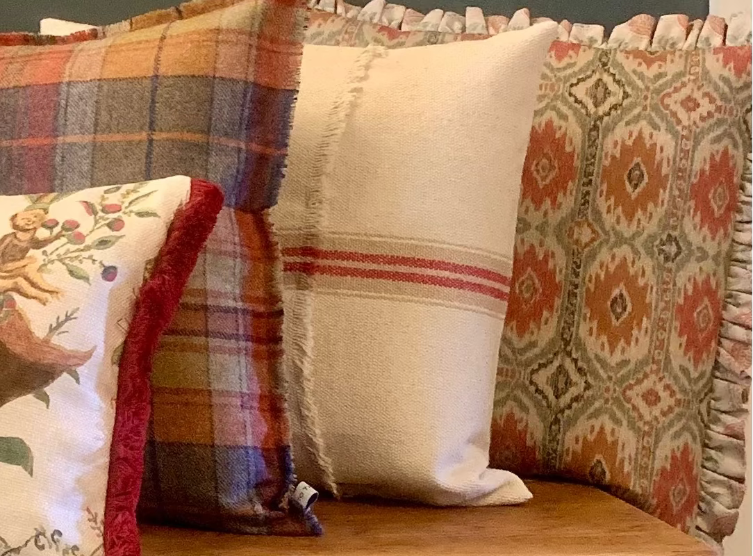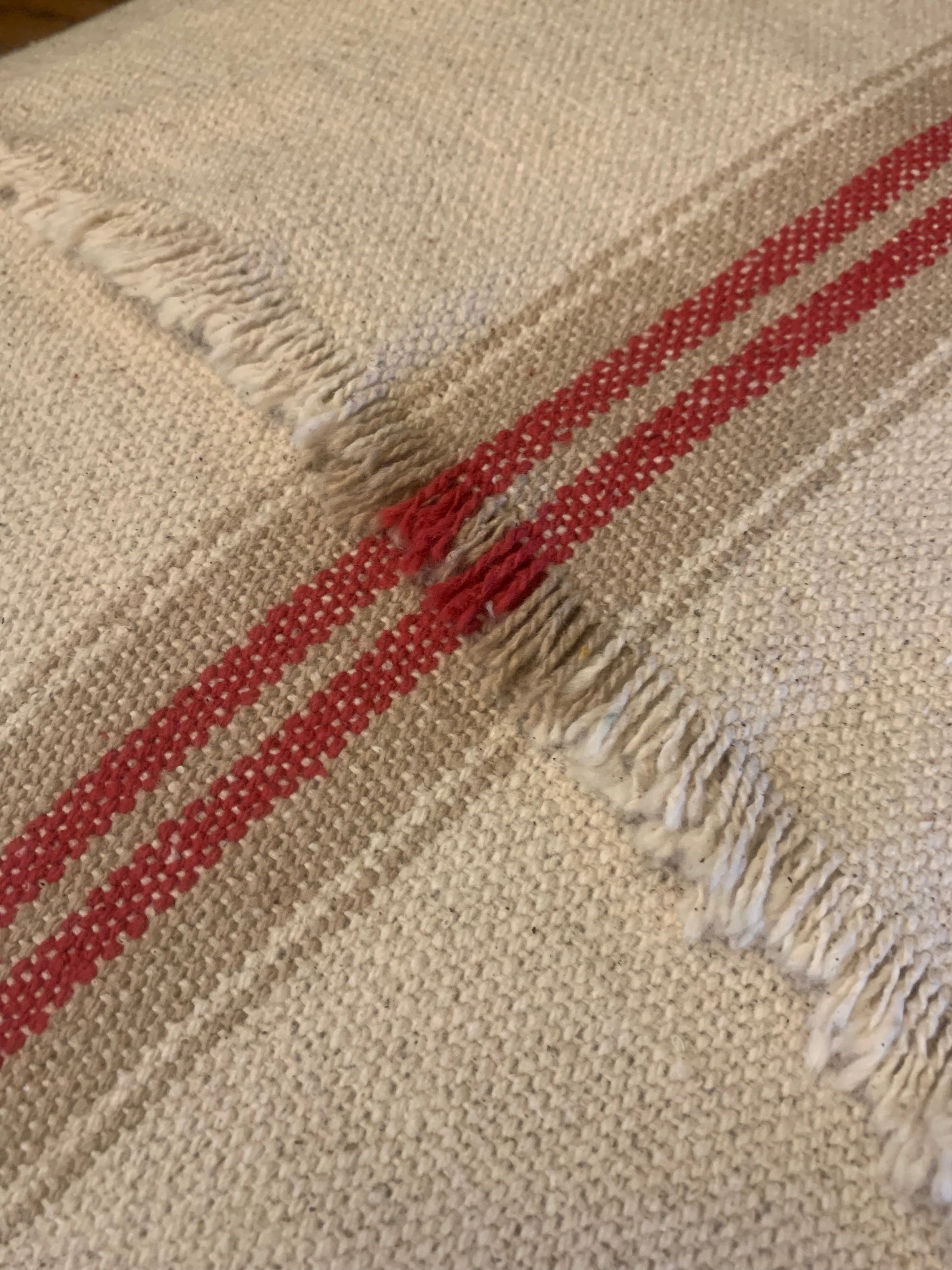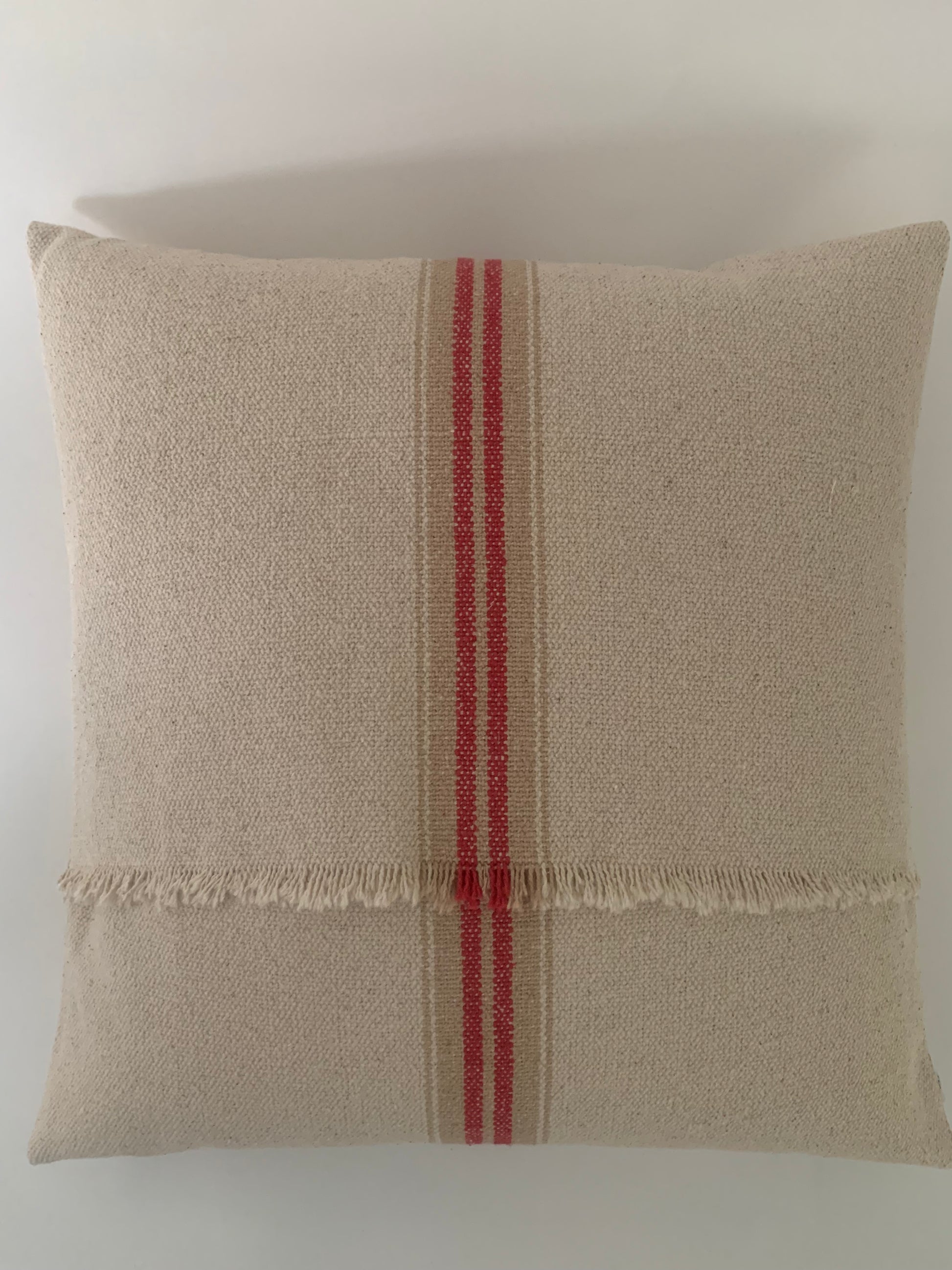 LINEN SACKING INSPIRED STRIPED CUSHION WITH RED AND KHAKI STRIPE