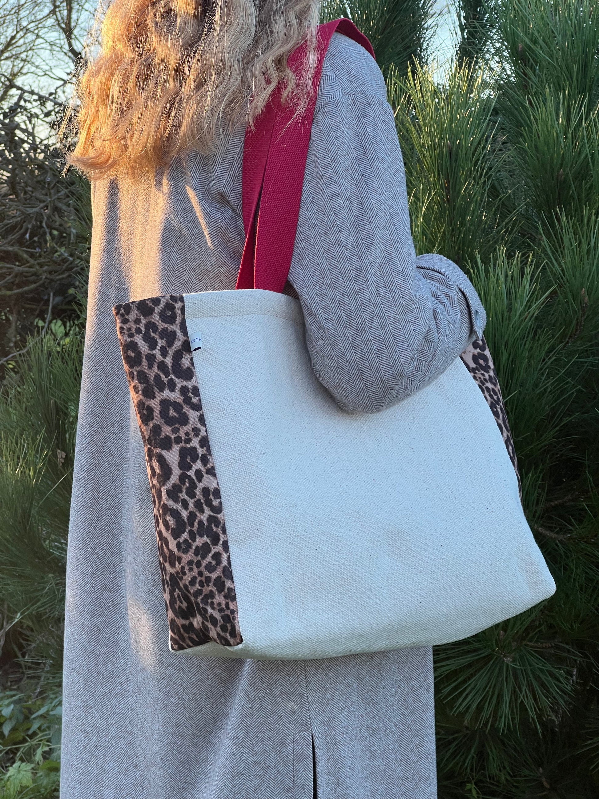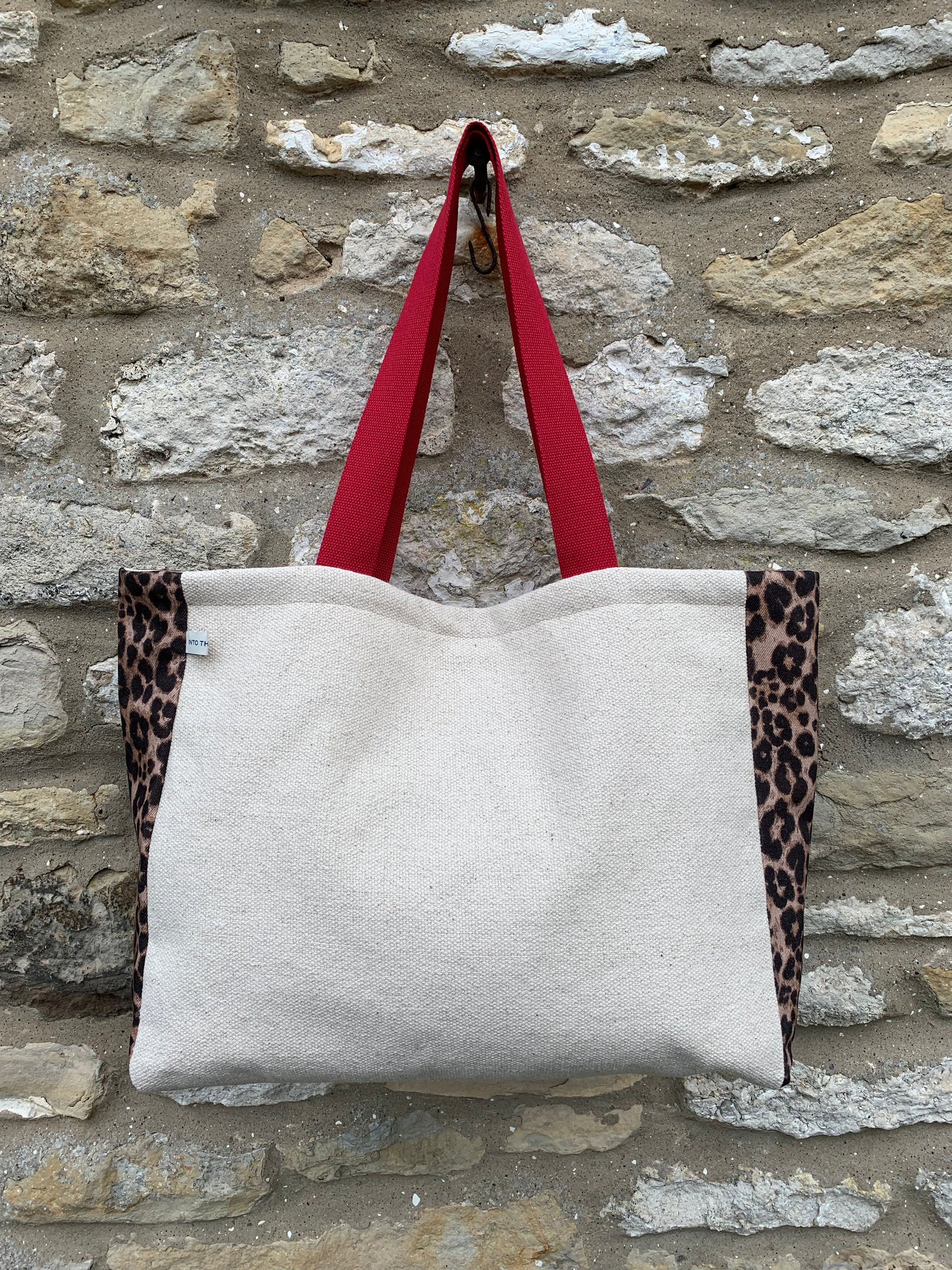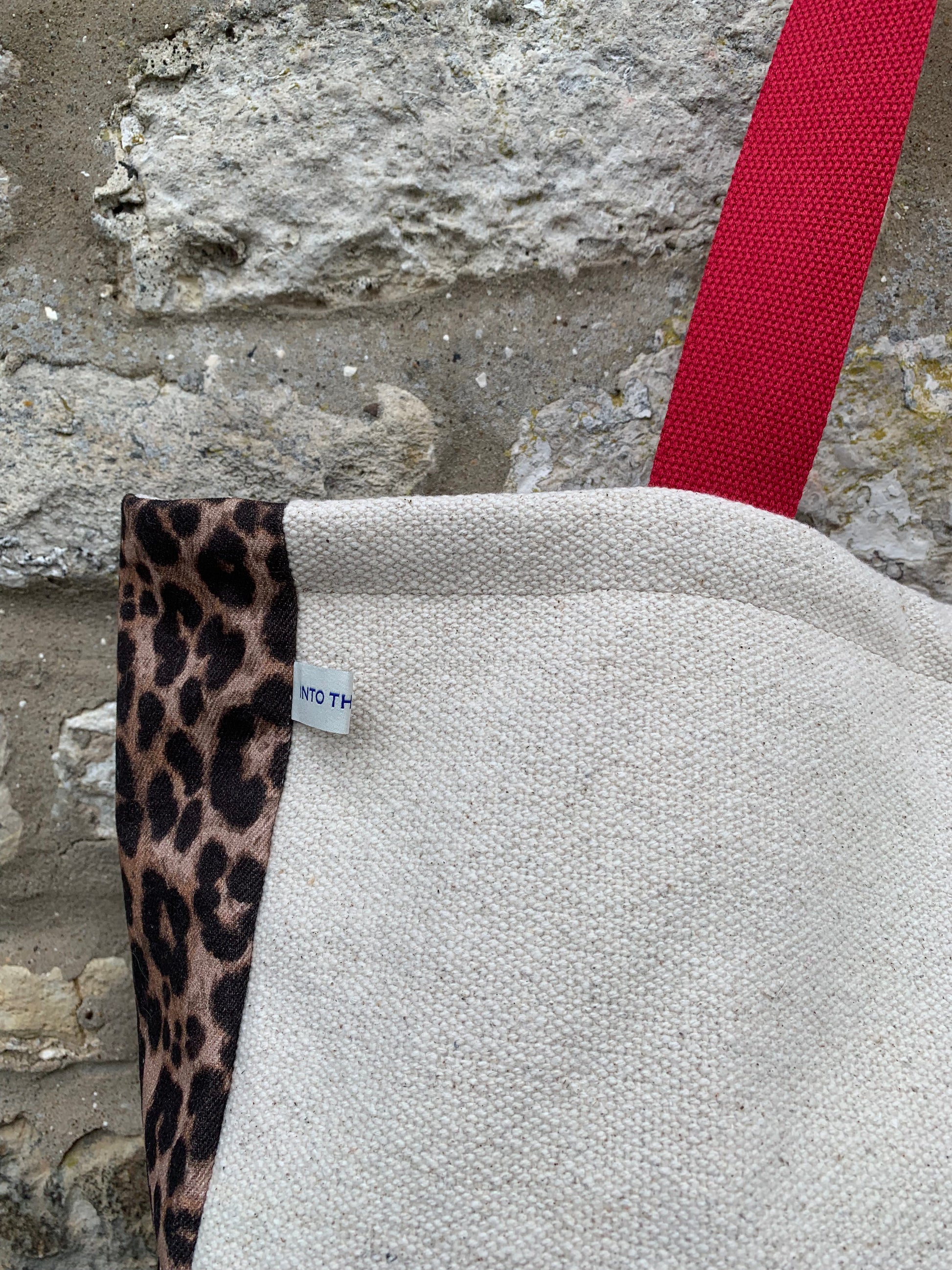 SOFT STRUCTURE WOVEN LINEN AND DENIM LEOPARD PRINT LARGE TOTEFULL COTTON LINING WITH INNER POCKET, METAL CLASP CLOSURE AND RED SHOULDER STRAPS