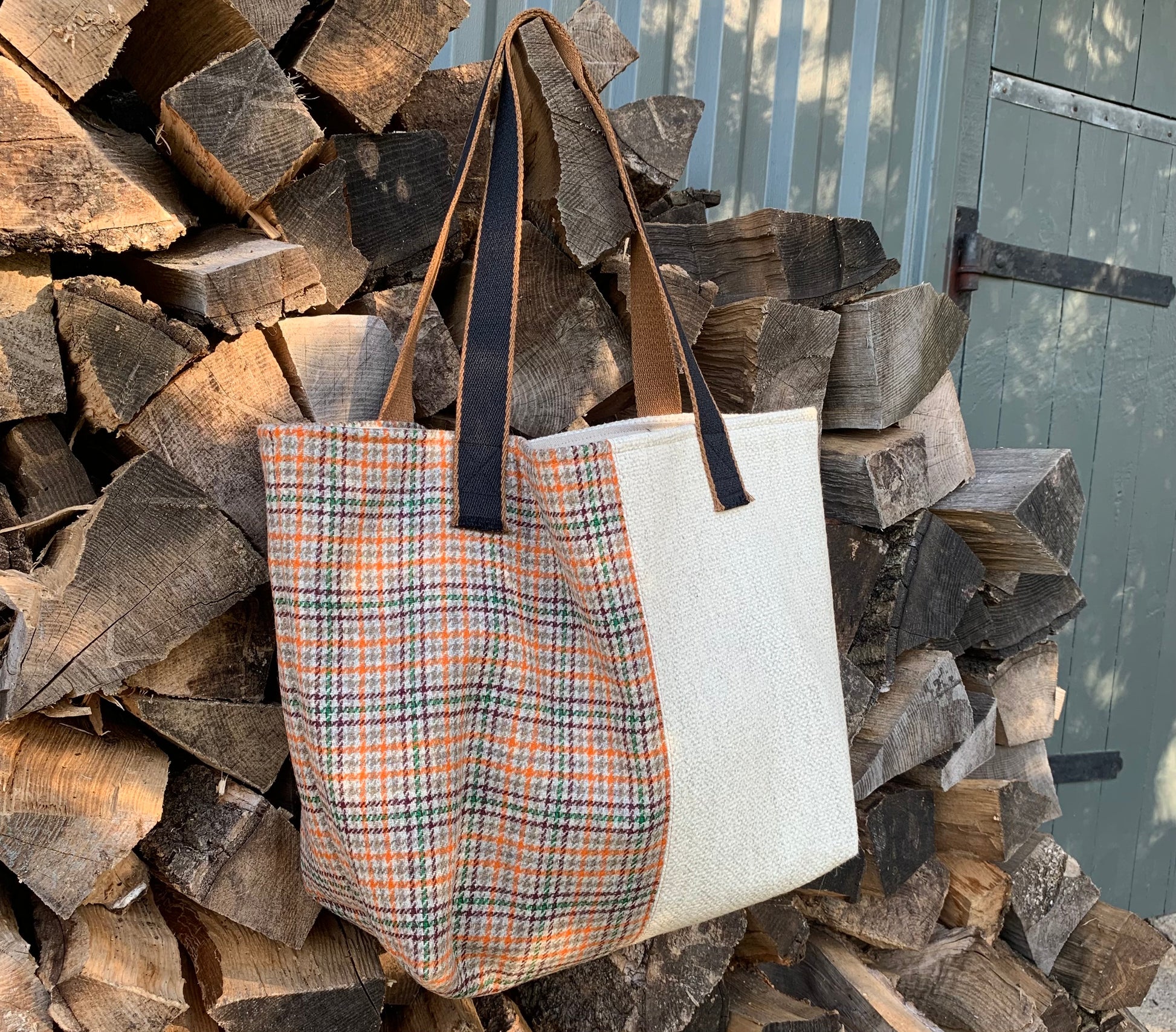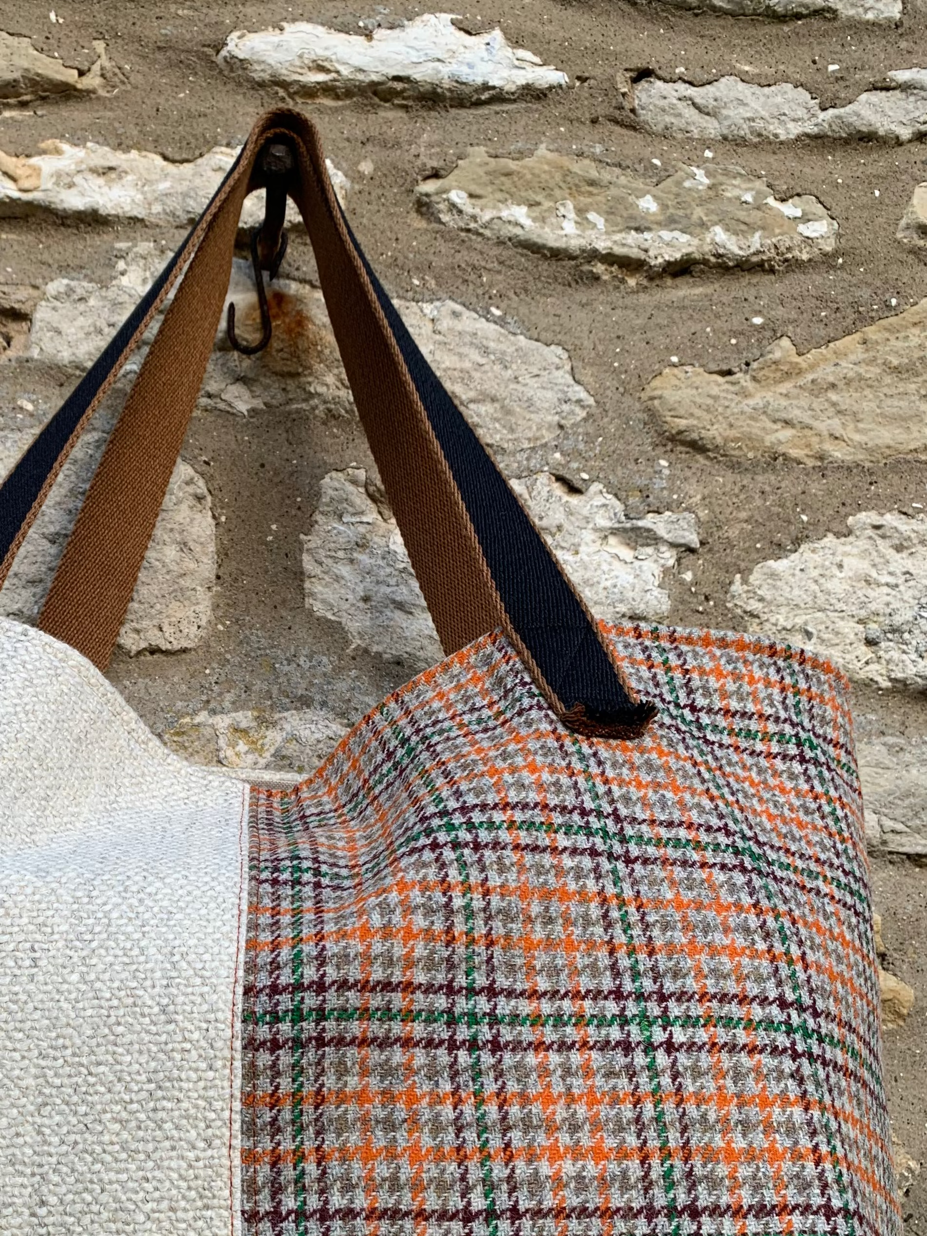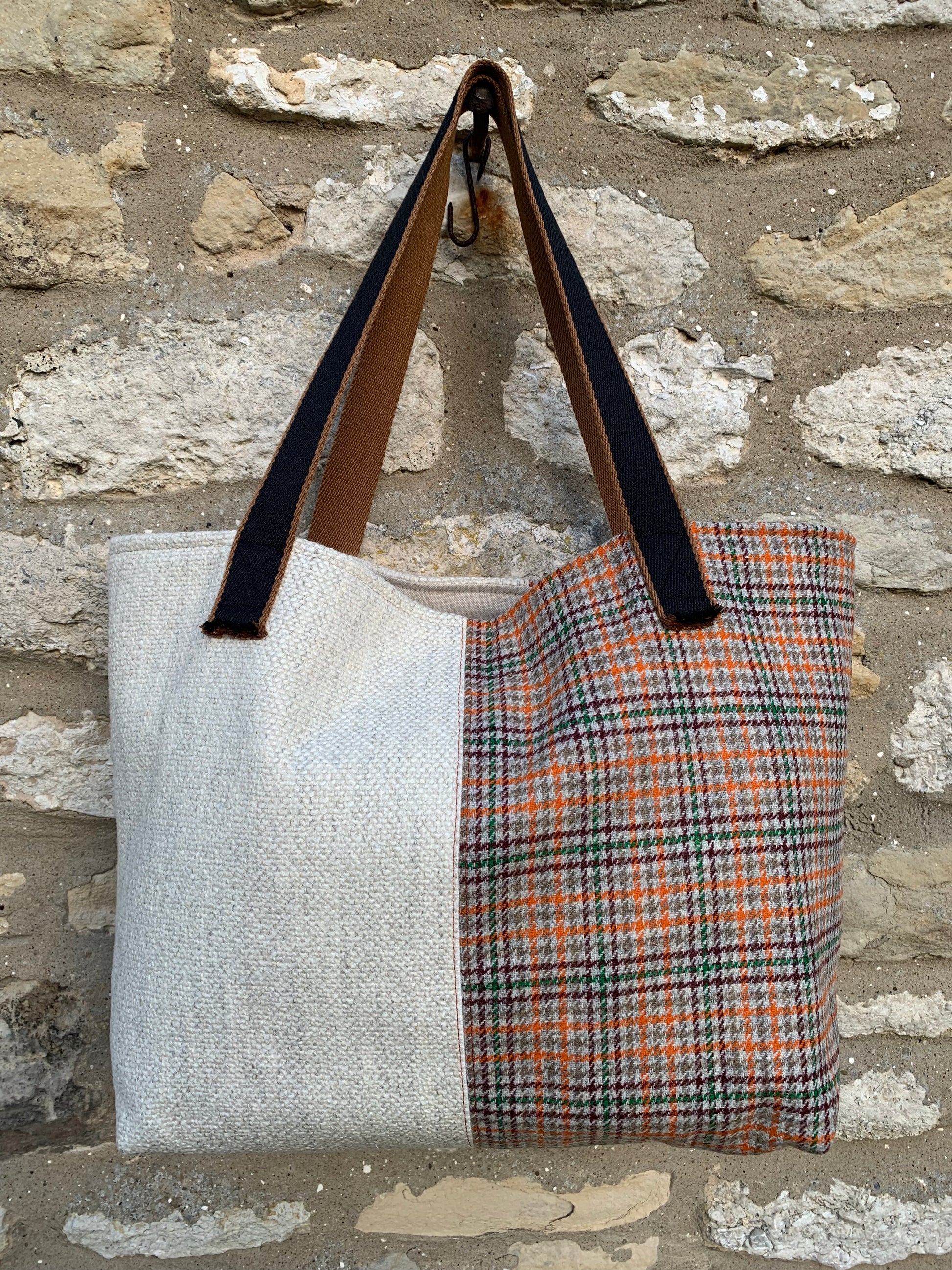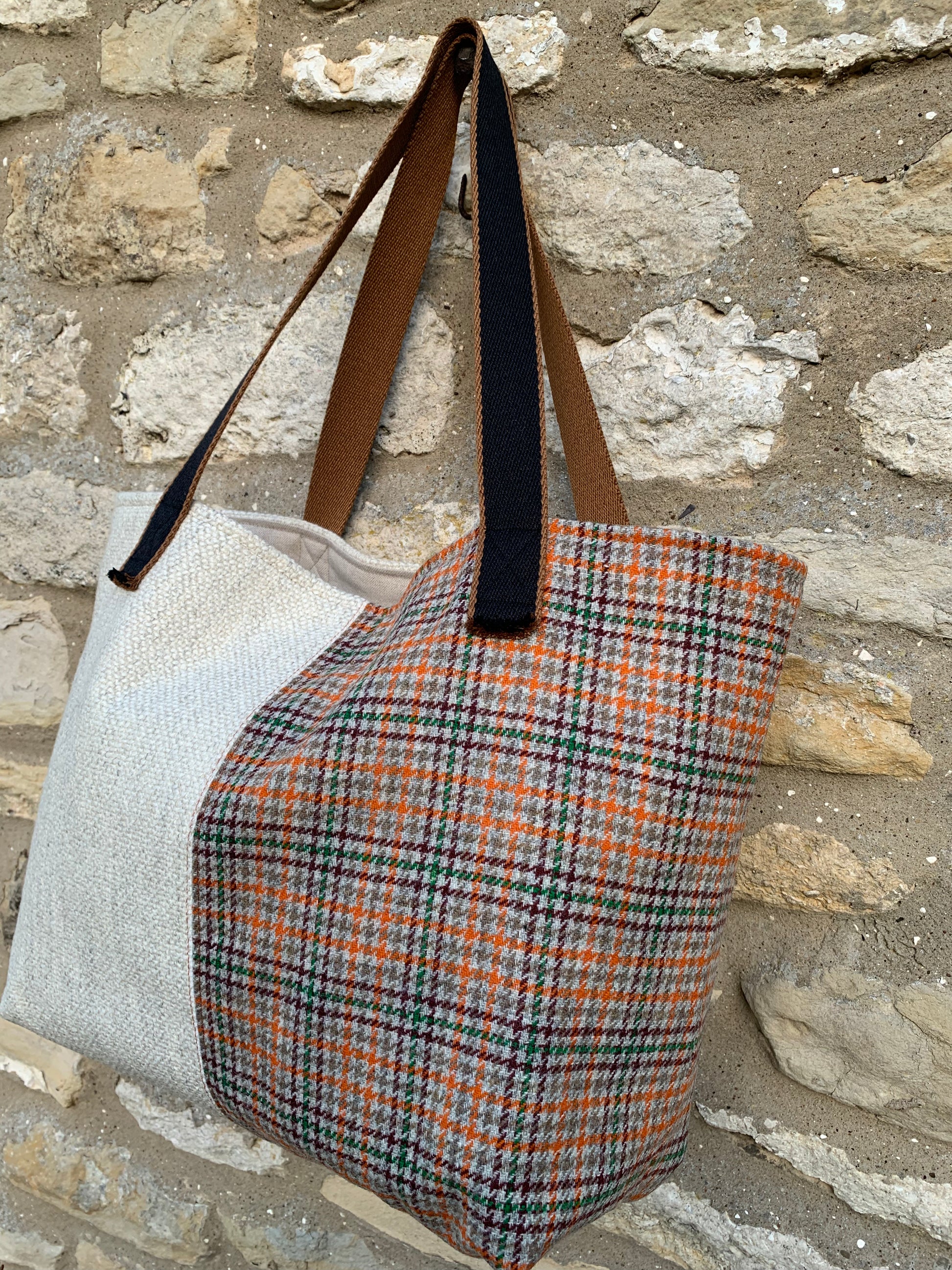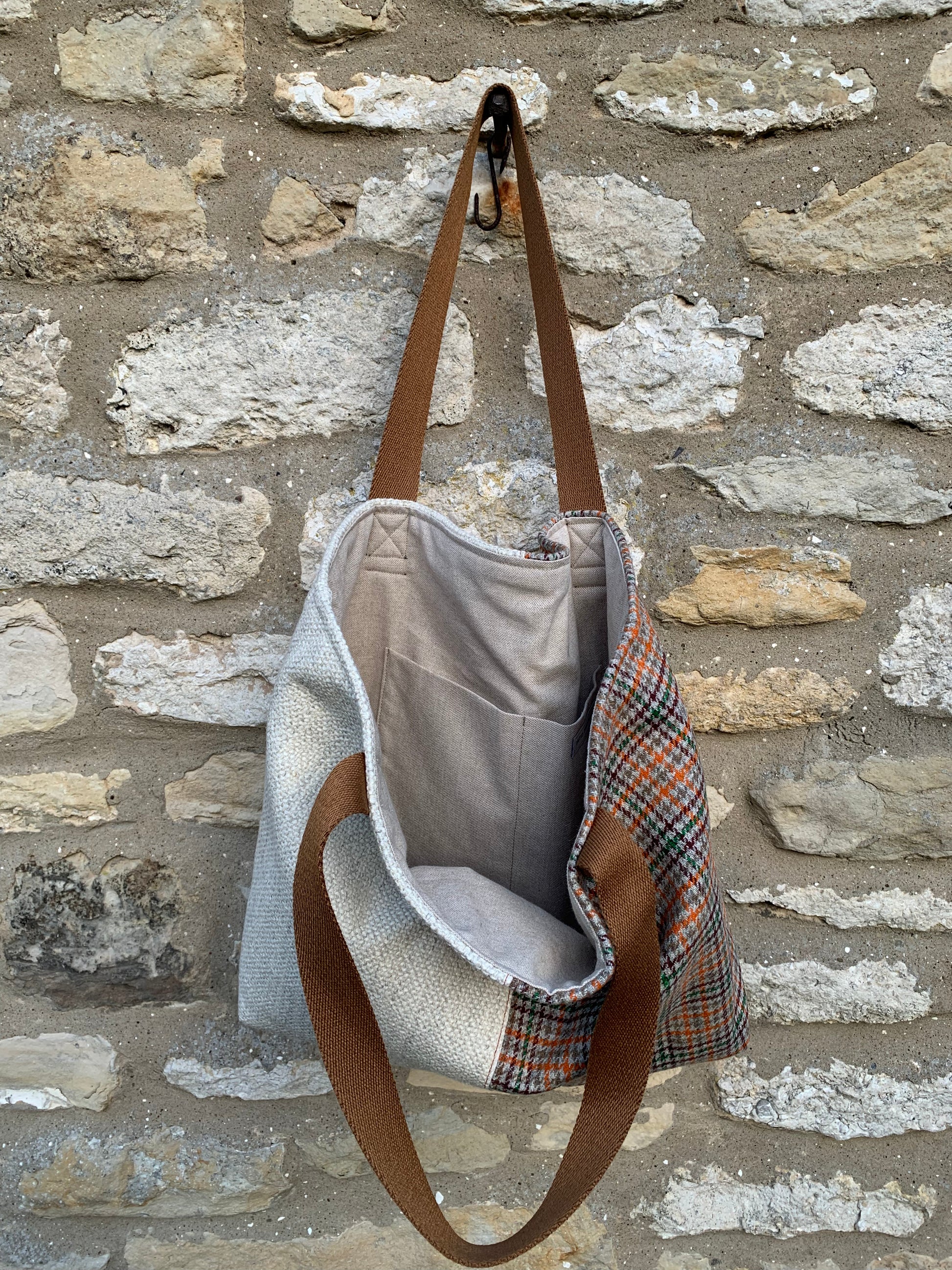 100% WOOL TWEED AND LINEN TOTE BAG NATURAL COTTON LINING WITH INNER POCKET, SHOULDER LENGTH STRAPS