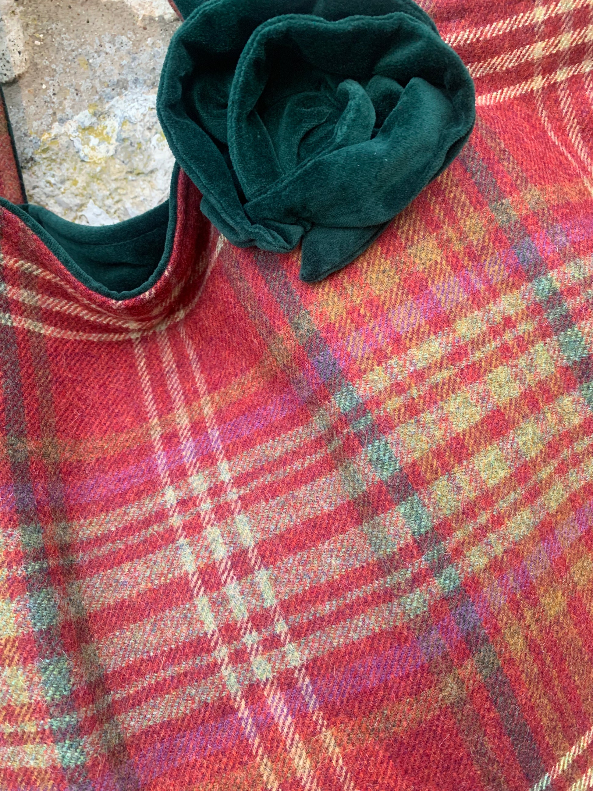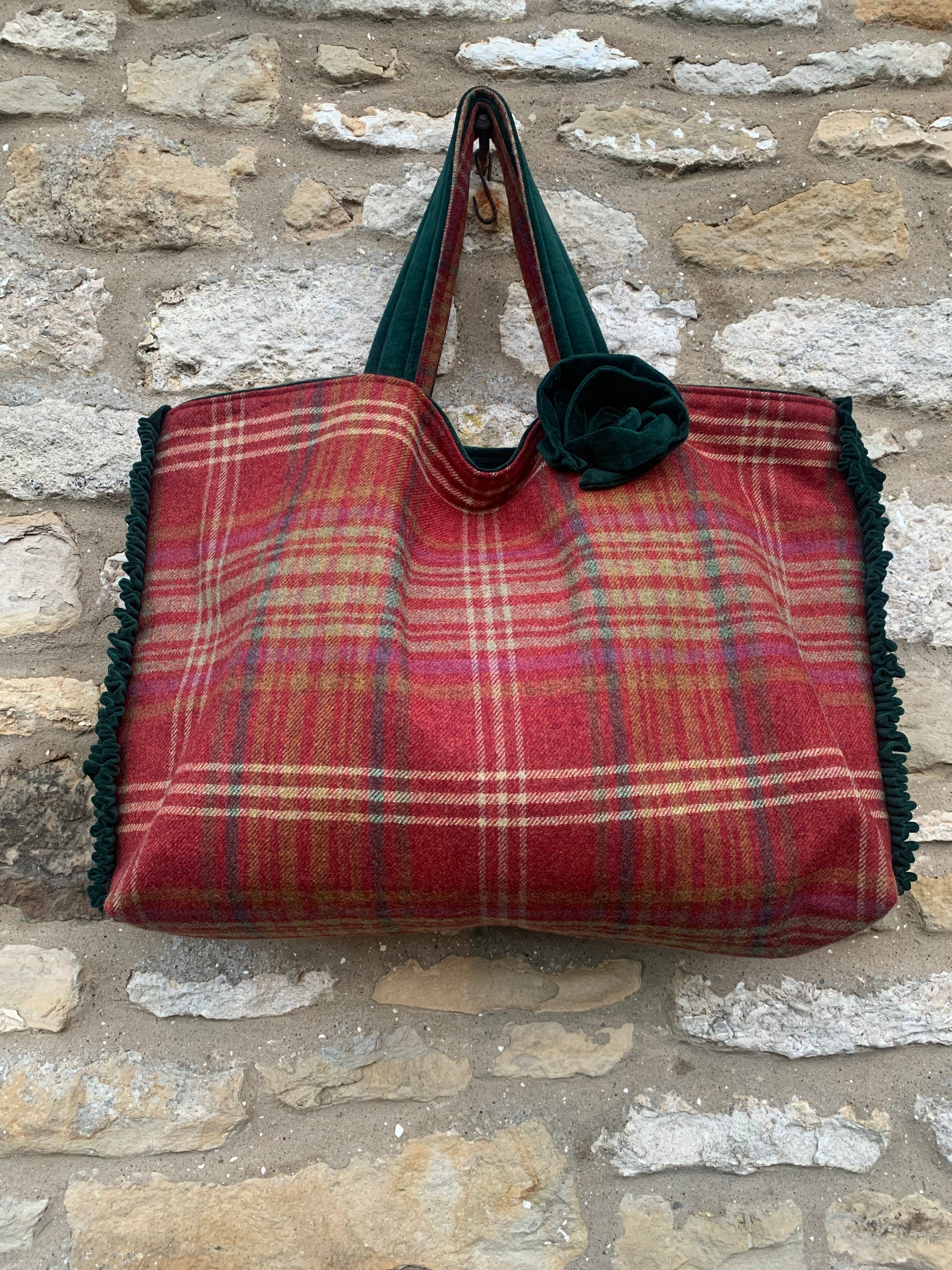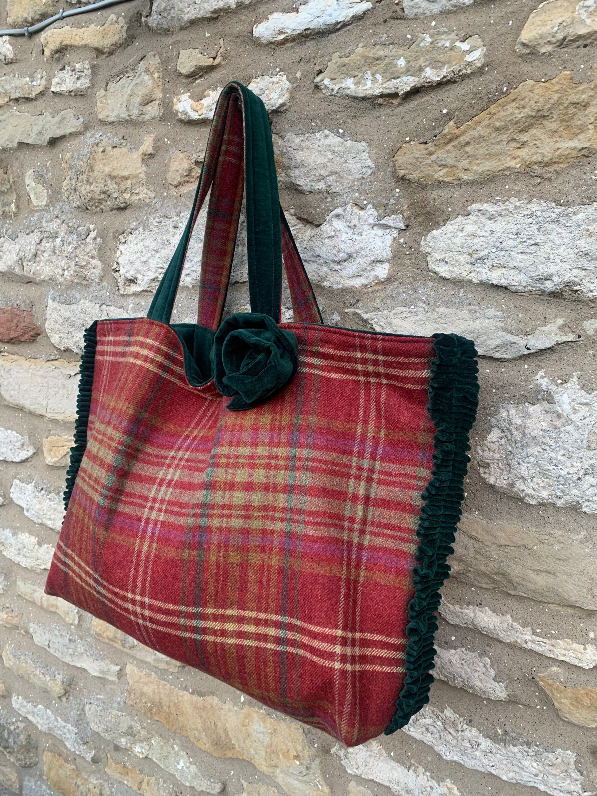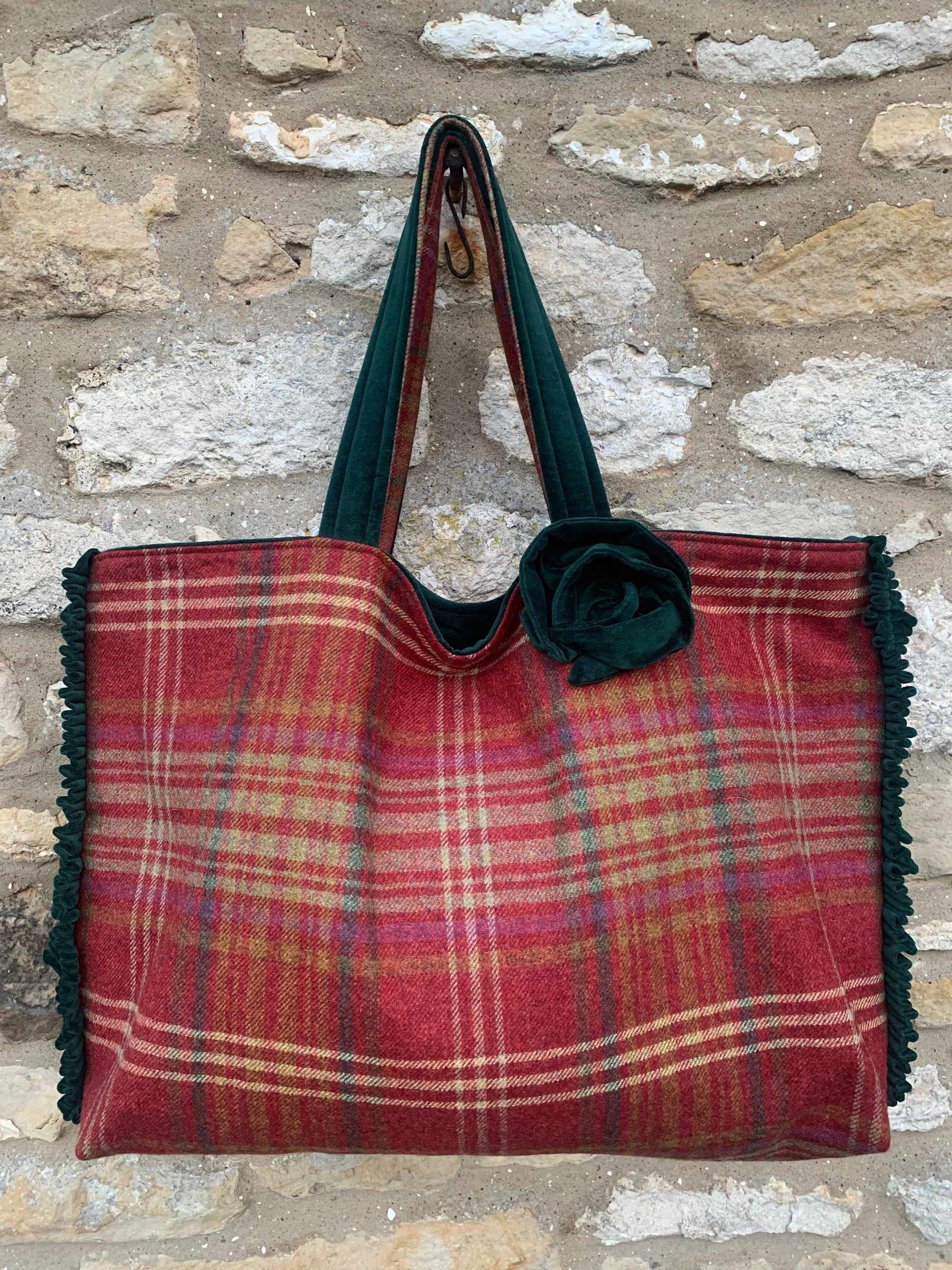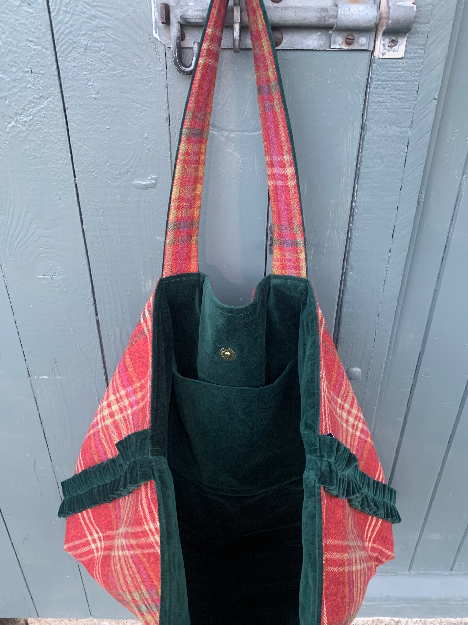 TWEED AND VELVET EXTRA LARGE TOTE, LUXURIOUS BOTTLE GREEN VELVET LINING WITH COMPARTMENTS. PRETTY VELVET CORSAGE ROSE AND SIDE GATHERED DETAIL. TWEED AND VELVET SHOULDER STRAPS.