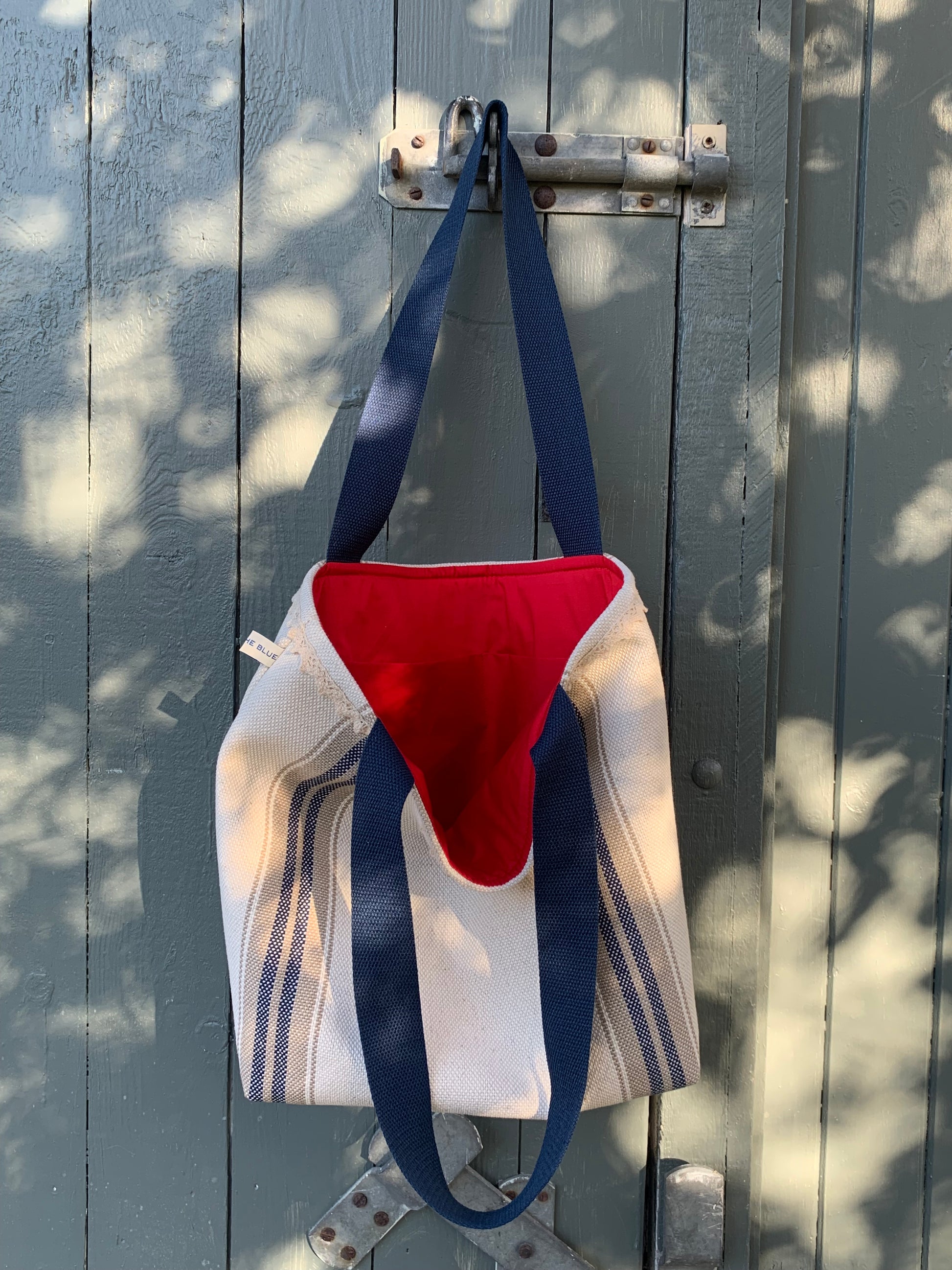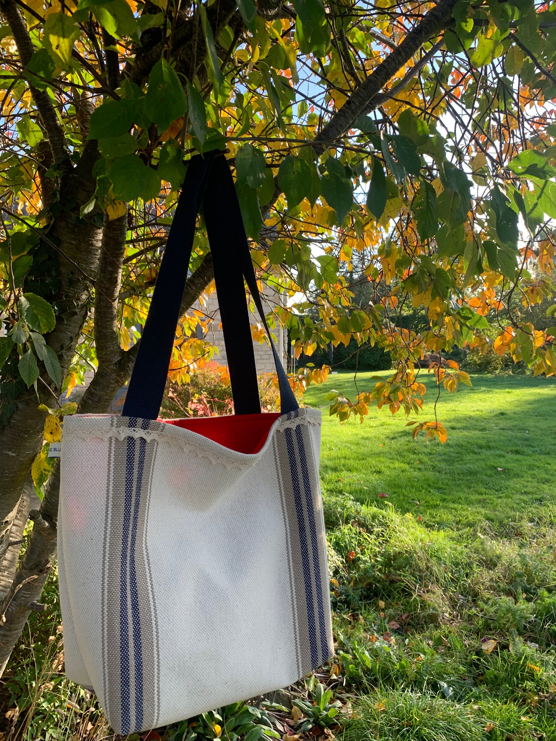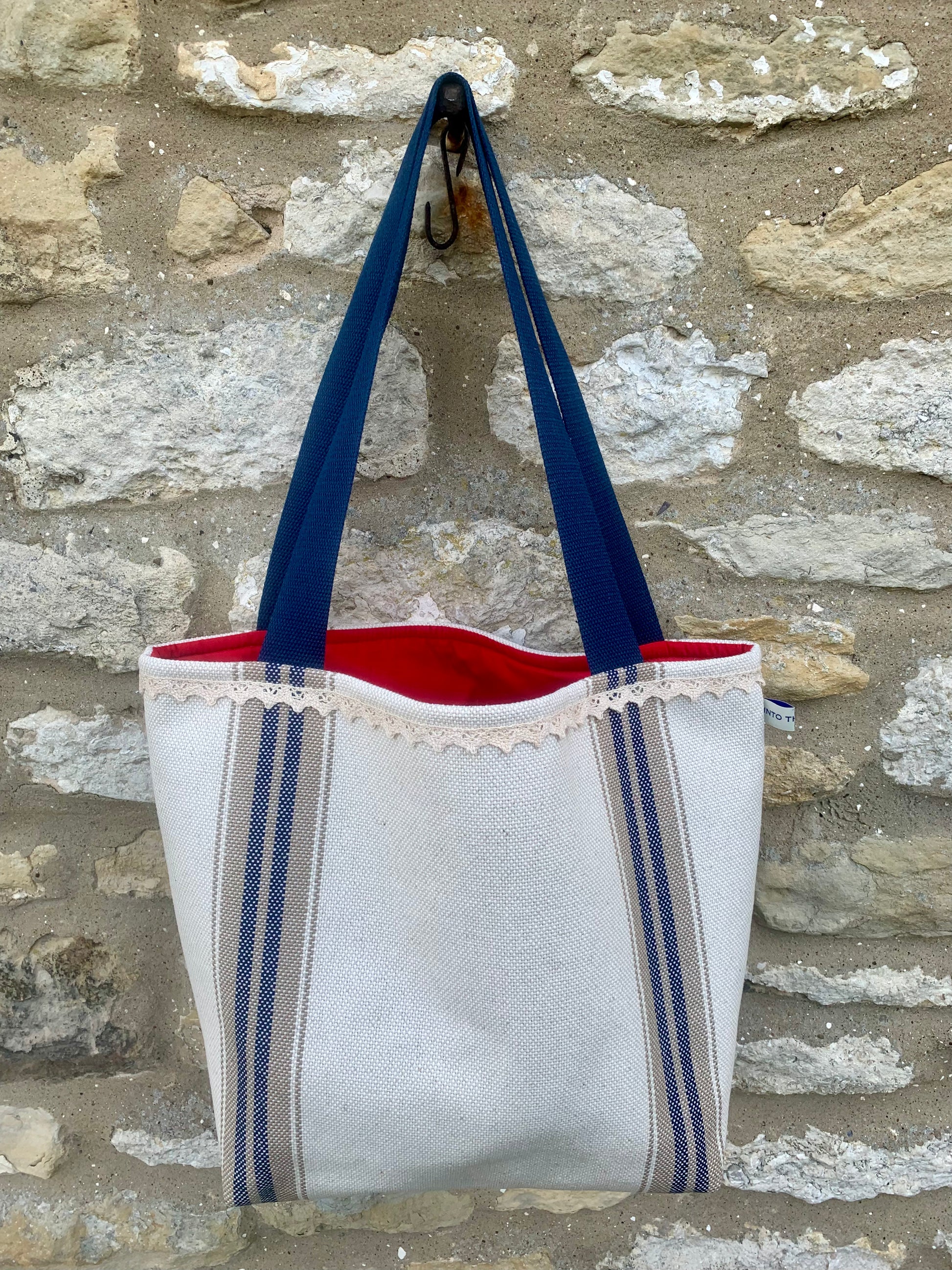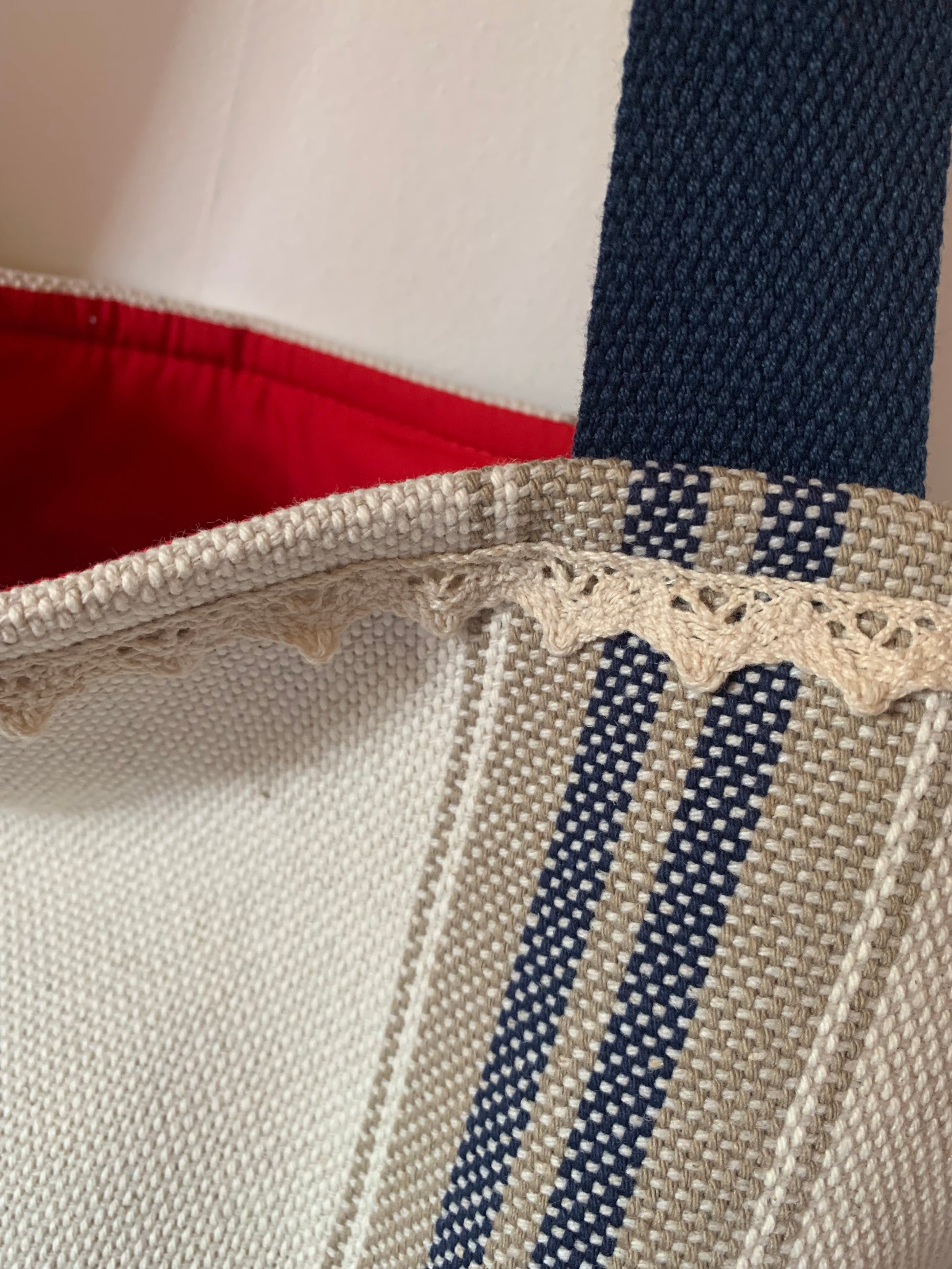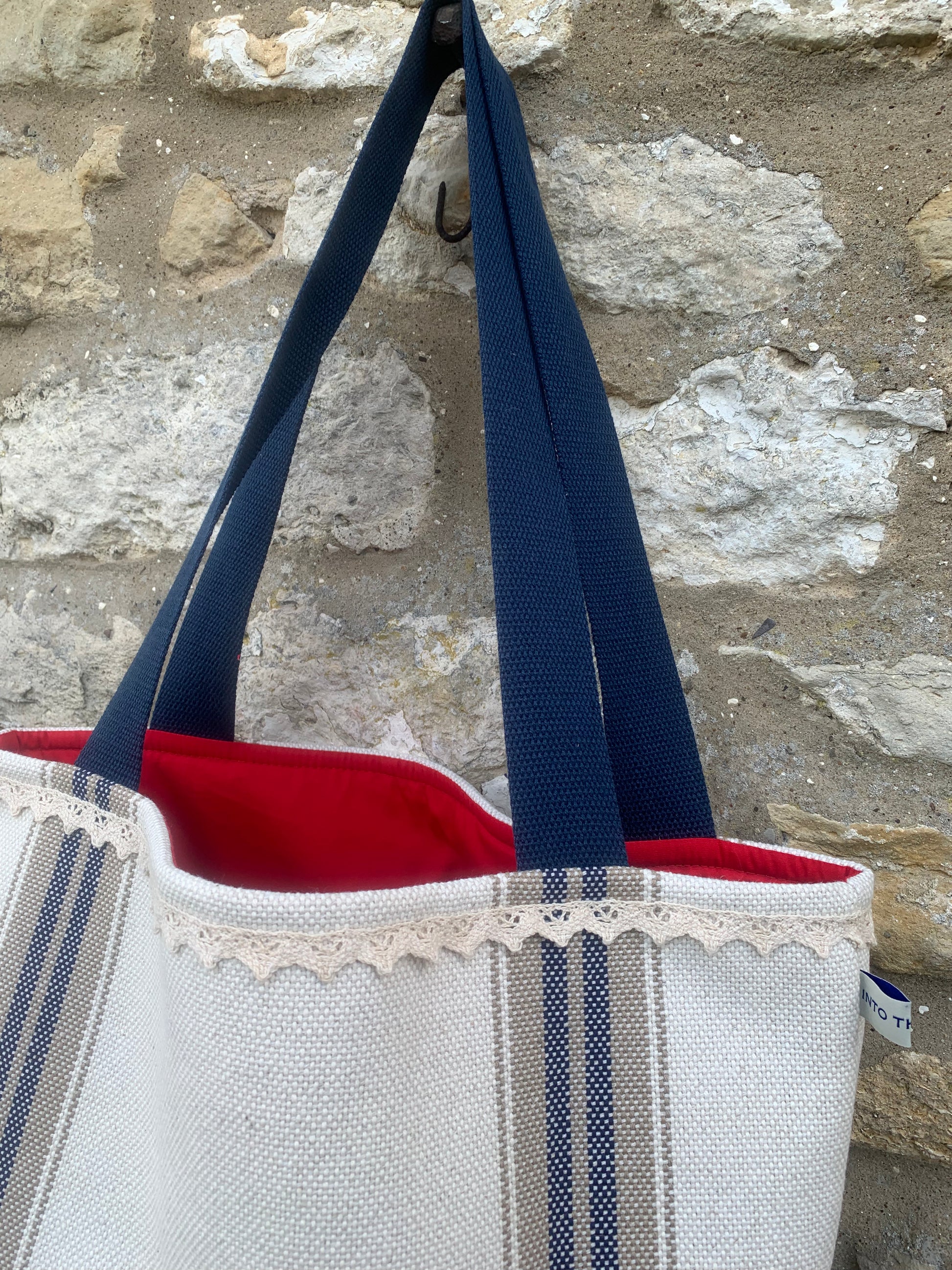 STONE LINEN NAVY/KHAKI STRIPE FRENCH SACK STYLE TOTE, VINTAGE LACE DETAILRED COTTON LINING, INNER POCKET