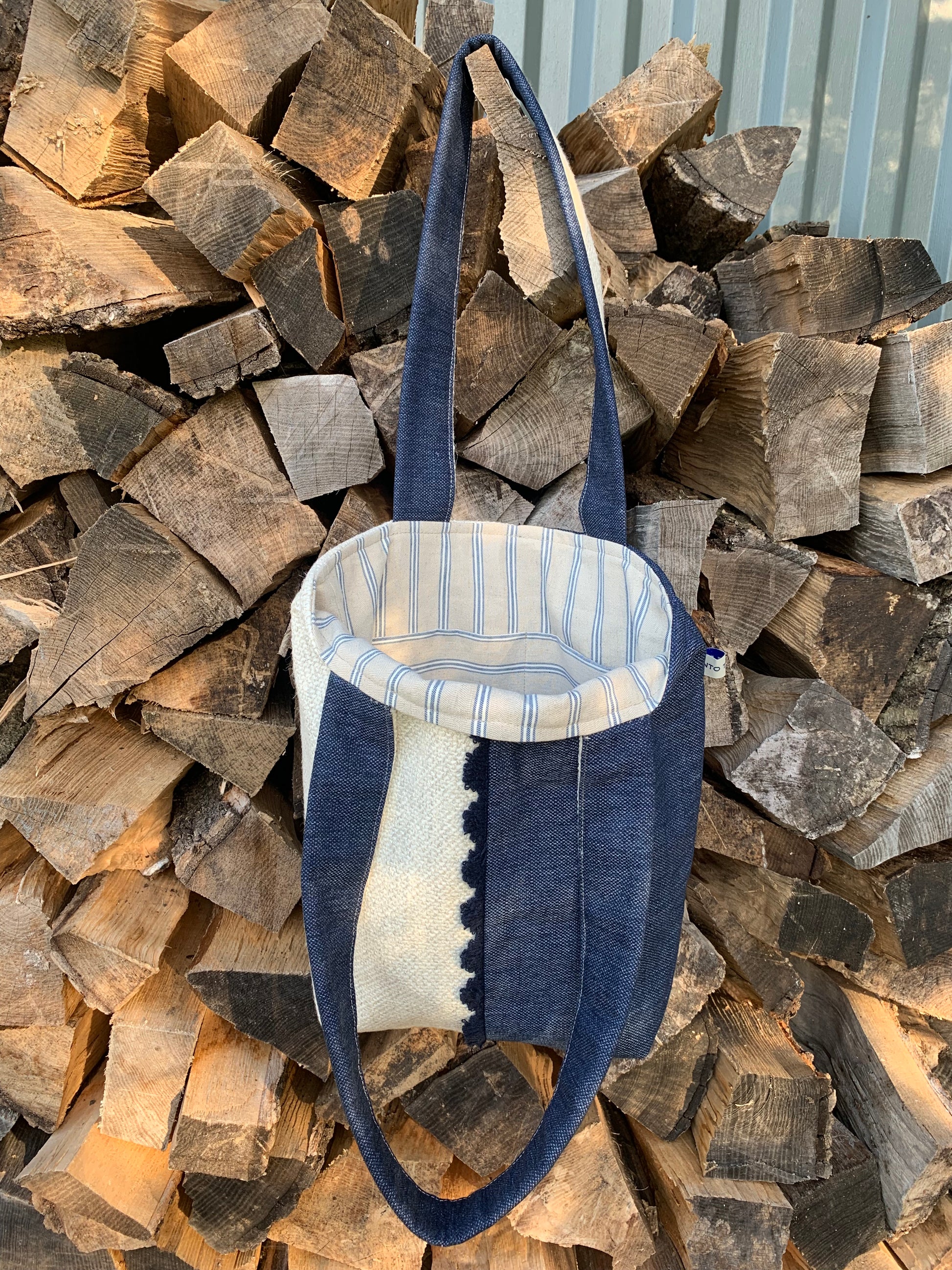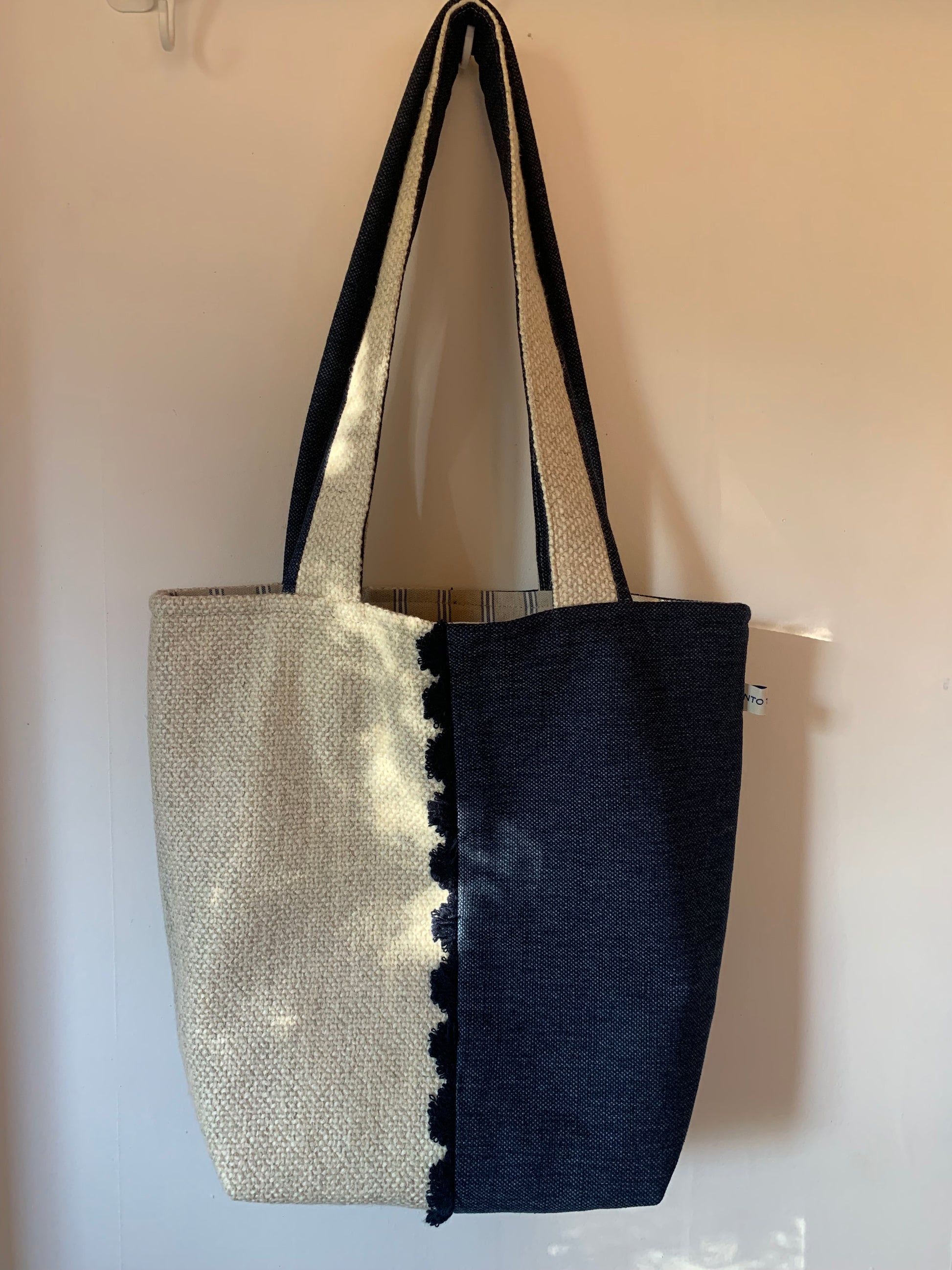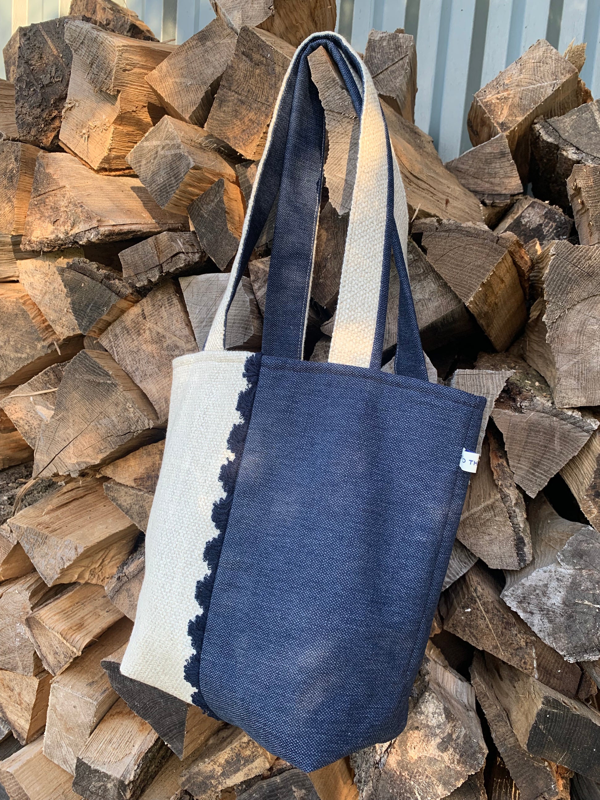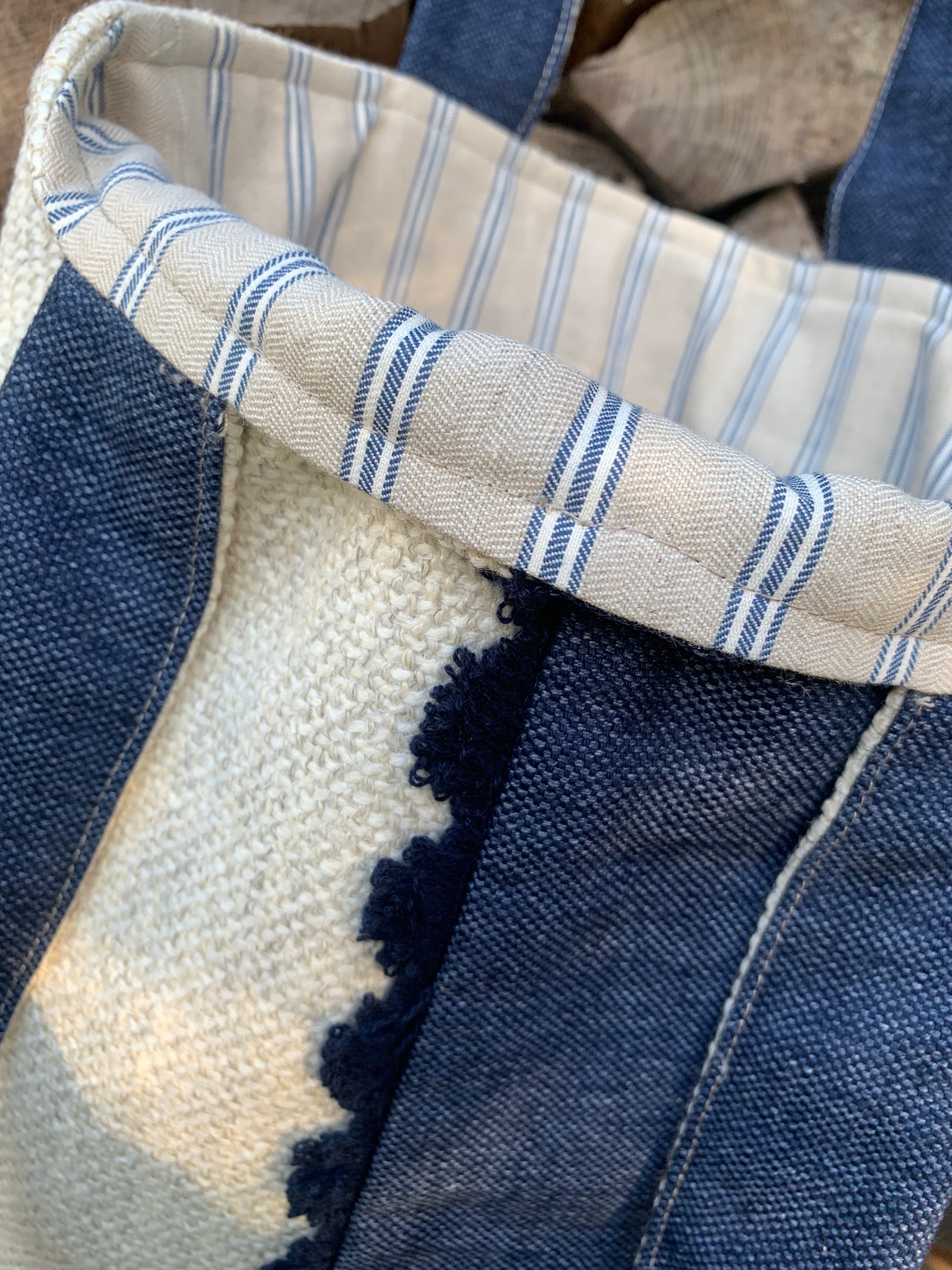 STONE BEIGE WOVEN SOFT LINEN, NAVY DENIM CONTRAST, DELICATE FAN TRIM DETAIL, STRIPED COTTON LINING, INNER POCKET, SOFT SHOULDER STRAPS
