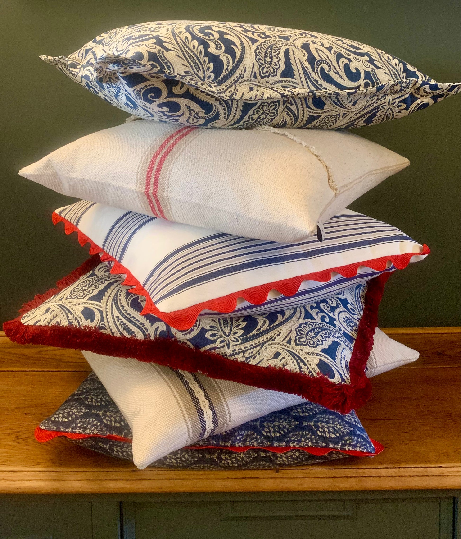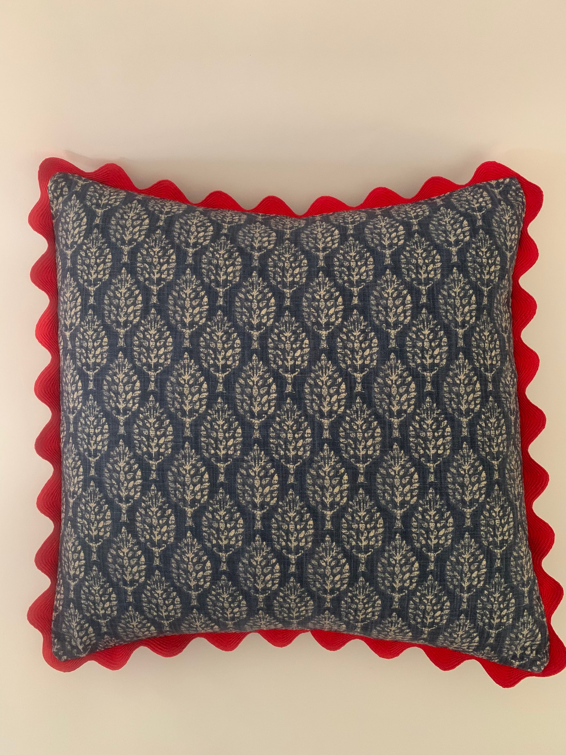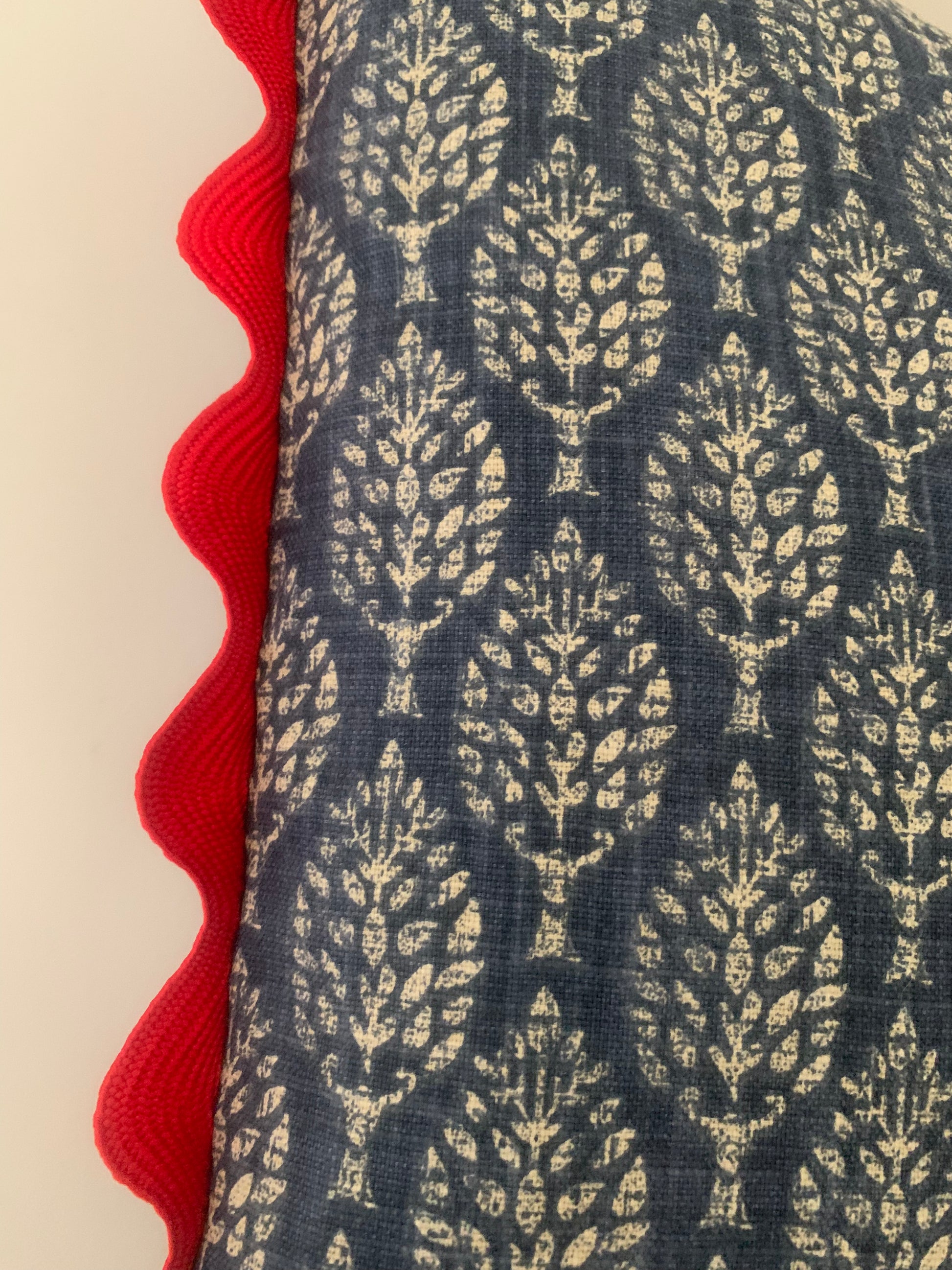 TIBET ROWAN TREE BLOCK PRINT IN NAVY AND BEIGE, TRIMMED IN SCARLET JUMBO RIC RAC